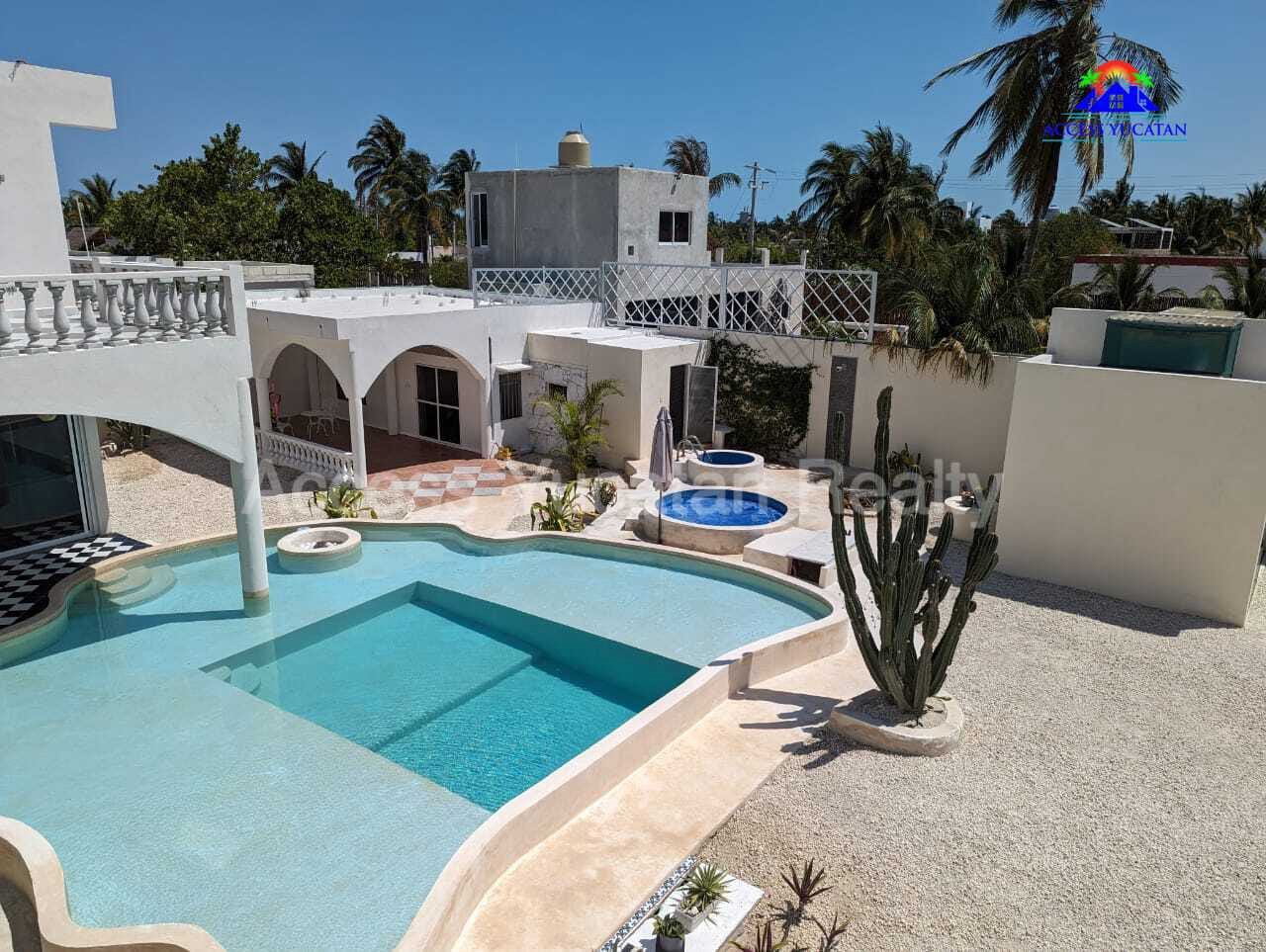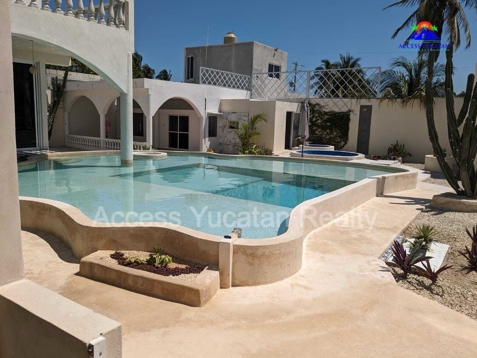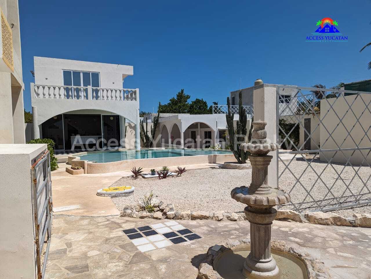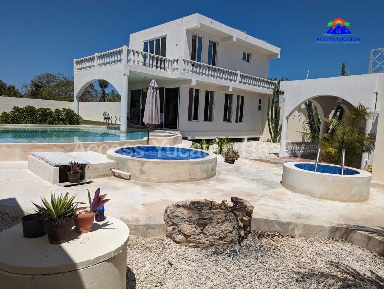 THIS IS A 5 BEDROOM 5.5 BATH PROPERTY WITH 3 SEPARATE BUILDINGS. OVERSIZED 1311.86 M2 LOT. 7 MINUTE WALK TO THE BEACH AND ABOUT 14 MINUTE WALK TO TOWN AND RESTAURANTS. FULLY WALLED AND GATED. FULLY FURNISHED AND TURNKEY WITH SMART HOME TECHNOLOGY CONTROLLED VIA CELL PHONE. THIS WOULD BE AN EXCELLENT AIRBNB RENTAL PROPERTY OR A MULTIFAMILY BEACH HOME. AMENITIES INCLUDE: MAIN HOUSE 2 LEVELS 1 MASTER BED UP, LIVING ROOM, KITCHEN HALF BATH DOWN 2ND HOUSE 3 LEVELS 3 BEDS EACH WITH BATH, KITCHENETTES CASITA 1 BED, BATH, KITCHENETTE SPECTACULAR POOL WITH LOUNGING PLATFORM HEATED JACUZZI TUB COLD PLUNGE POOL HEATED SAUNA ROOM OUTDOOR SHOWER SEPARATE ENTRANCES FOR ALL 5 UNITS MULTIPLE COVERED BALCONIES FOR AWESOME VIEWS LIGHTED SOCCER FIELD, RIDING MOVER INCLUDED 18KW AUTOMATIC GENERATOR FOR ENTIRE PROPERTY SOLAR SYSTEM A/C SECURITY CAMERA SYSTEM 3 DEEP WELLS WITH PRESSURIZED WATER AUTOMATIC IRRIGATION SYSTEM PLENTY OF INDOOR AND OUTDOOR STORAGE NICELY LANDSCAPED SECURED PARKING OWNERS ARE ASKING $449,000 USD FOR MORE INFORMATION AND OR TO SCHEDULE A VISIT CONTACT: TOM STEC +52-999-493-5066 WHATSAPP THOMASJSTEC@GMAIL.COM ACCESSYUCATANREALTY.COM