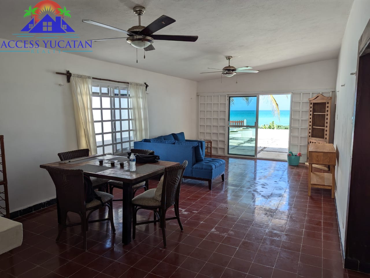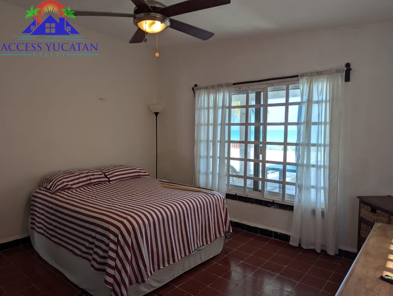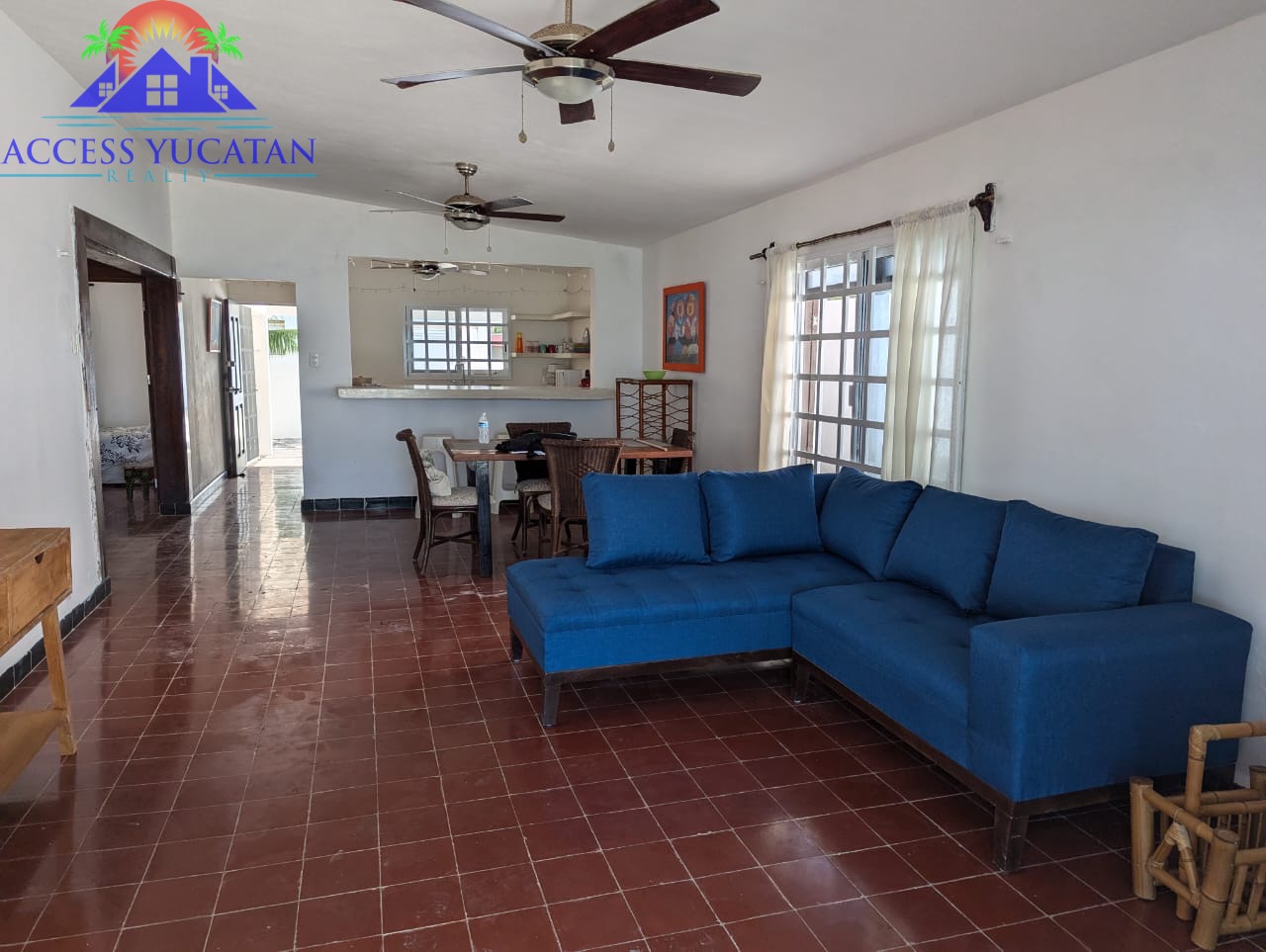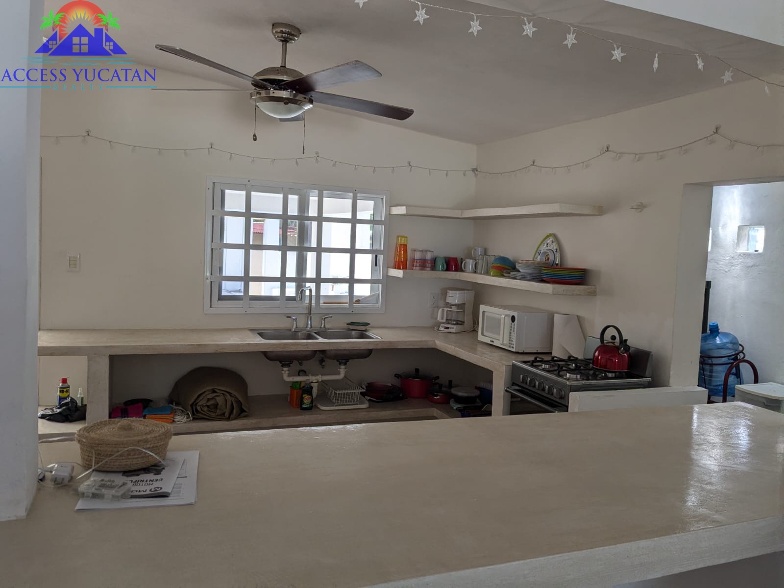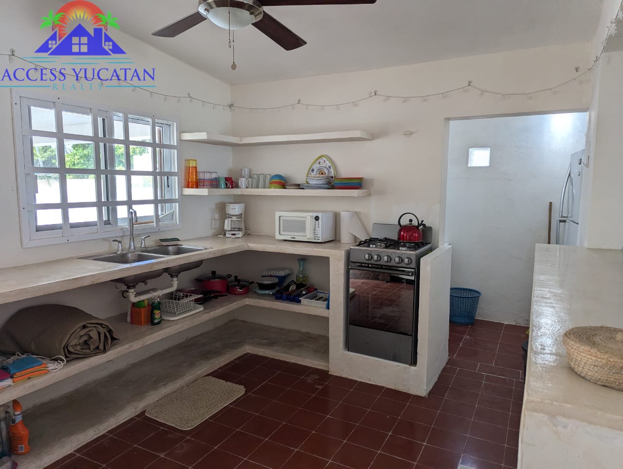 CASA DE PEZ VELA IS A BRIGHT WELL MAINTAINED 2 BEDROOM 1 BATHROOM BEACH HOUSE IN THE EDGE OF TOWN. WALLED AND GATED WITH PLENTY OF COVERED PARKING. REMODELED KITCHEN FEATURES A DOUBLE SINK AND LARGE WALK IN PANTRY WITH A BREAKFAST BAR. GREAT ROOM WITH SLIDERS OPENS TO A PARTIALLY COVERED DOUBLE TERRACE OVERLOOKING THE GULF AND A LARGE FILTERED POOL WITH BUILT IN LOUNGE AREA AND BUILT IN SEATING IN THE DEEP END. LOTS OF OPTIONS FOR EXPANSION WITH THIS PROPERTY. EVERYTHING IS INCLUDED, FURNITURE, APPLIANCES, DOWN TO THE KITCHEN UTENSILS. JUST OPEN THE GATE, STEP ONTO THE BEACH AND LET YOUR MEXICAN DREAM BEGIN. LOT APPROX 11M X 35M ORIGINAL MEXICAN TILE AND WOODWORK ALUMINUM SLIDING GATE WALLED REMODELED KITCHEN AND BATH ALUMINUM WINDOWS, SCREENS, PROTECTORES HURRICANE SHUTTERS PRESSURIZED CITY WATER, WELL WATER STATIONARY GAS TANK LARGE BUILT IN SAFE A/C IN MASTER SEAWALL AND GATE TELMEX FIBER OPTIC INTERNET THIS IS THE BEACHFRONT BARGAIN YOU HAVE BEEN WAITING FOR! OFFERED AT 449000 USD FOR MORE INFORMATION OR TO SCHEDULE A SHOWING CONTACT TOM STEC ON WHATSAPP 52 9994935066 ACCESSYUCATANREALTY.COM